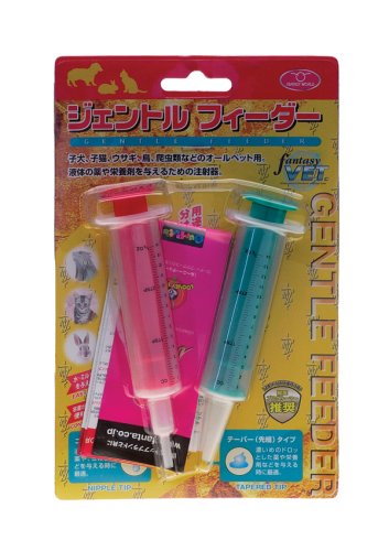 【使用方法】〔ニップル(乳首)タイプ〕(1)注射器のピストンを押し込みます。(2)先端を薬の中に入れます。(3)適切な分量の液体を吸い込むようにピストンを引き上げます。(4)ジェントルフィーダーをペットの口に向け、窒息させないよう気を付けて投与してください。 〔ティーパー(先細)タイプ〕(1)注射器からピストンを取りだし、注射器の中に適切な分量の薬を注ぎ入れ、ピストンをもどします。(2)ジェントルフィーダーをペットの口に向け、窒息させないよう気を付けて投与してください。